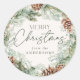 Elegantes pegatinas vacacionales con una corona de pinos en color agua, ramos de pino y exuberante vegetación con un fondo de crema clara. "Feliz Navidad" se muestra en un guión verde oscuro con tu nombre que se muestra a continuación.