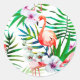 Una obra de arte tropical con flamencos rosas y plantas verdes de selva tropical con flores de hibisco y palmeras sobre un fondo blanco neutro. Una divertida y colorida obra de arte.