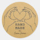 Resalte el toque personal de sus productos hechos a mano con este encantador pegatina "hecho a mano" que presenta un ilustracion único de manos formando un corazón. En un fondo de papel kraft, este diseño respira un ambiente rústico y artesano, perfecto para pequeñas empresas, artesanos y artesanos que quieren darle un toque cálido y personal a su embalaje. Personalizar con su nombre o nombre comercial para hacer que cada artículo se sienta especial y cuidadosamente hecho. Ideal para sellar paquetes, marcar productos hechos a mano o añadir una firma única a sus productos.