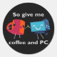 Un tazón de café y una computadora pc de alto cinco años al estilo personalizado. texto: "dame café y pc"