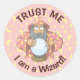 Viejo mago con capa rosa mirando la bola mágica de cristal.