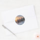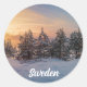 Pegatina Redonda Atardecer sobre bosque de nieve congelado cerca de