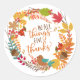 Estos pegatinas temáticos del Día de Acción de Gracias presentan el guión "En todas las cosas dan gracias" dentro de una corona de otoño de bonito. La corona está hecha de hojas de color marrón, oro y cardenales, vainas de semillas y ramas, con un pájaro pequeño en el fondo.