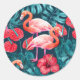 Pegatina Redonda Aves flamencas y acuarela de jardín tropical