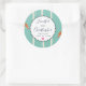 Un boda te agradece pegatina con un ilustracion de abedules con pájaros naranjas sentados en sus ramas. Fondo de color verde retro. En la parte superior hay un círculo de vieiras con tu información en el interior.