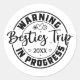 Este divertido pegatina redondo presenta el texto en negrita "Advertencia: Viaje a Besties en progreso" con un año de personalizable. El color y el año de diseño se pueden cambiar a cualquier sombra que desee, lo que le permite coincidir con el color de fondo preferido. Perfecto para decorar el equipaje, los diarios de viaje, los favores de fiesta o los regalos para su mejor escapada. ¡Un gran placer para las fiestas de soltera, los viajes de chicas o cualquier aventura inolvidable con amigos!