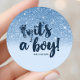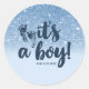 Azul Marino Glitter Ombre Es Un Niño Stickers para Baby Shower. Sticker moderno y trendy para baby shower con brillo azul falso y un fondo de color azul bebé personalizable con texto y detalles de la fiesta.