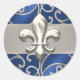 Pegatina Redonda Azul y plata Filigree Swirls Fleur de Lis