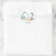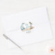 Pegatinas con temática de surf para sus invitaciones a la ducha de bebé, favores de fiesta y tarjetas de agradecimiento con un ilustracion acuarela de una escena de playa con olas de ruptura, palmeras, costas arenosas, pez estrella y tablas de surf, y "Baby on Board" exhibido en un divertido guión azul retro. Añade el nombre de la madre y la fecha de la ducha con letras simples.