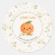 A sweet watercolor Little Cutie baby shower design with a smiling orange, white blossoms, sage vines, and a soft background. Perfect for citrus baby showers.