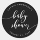 pegatina de Baby Shower con las palabras "Baby Shower" en un guión cursivo relajante en blanco contra un fondo negro. Personalízalo reemplazando el texto del marcador de posición. Para obtener más opciones como cambiar el tipo de letra y su tamaño/color, expanda la curva /contract o el espaciado entre letras haga clic en el botón "Personalizar". *Tenga en cuenta que la marca de agua Zazzle que aparece en la vista previa del zoom NO aparecerá en el producto impreso final. © Rosewood y Citrus