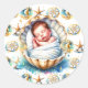 Pegatina Redonda Baby Shower de un chico de playa con temática cost