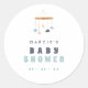 Una moderna ducha de bebé azul favorece a un pegatina que presenta el ilustracion de una cuna de bebé móvil con estrellas, nubes y luna. "baby ducha" está en negrita azul. Personaliza tus datos. ...