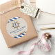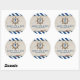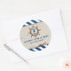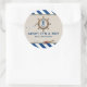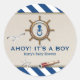 Las duchas infantiles de temática náutica son una forma divertida de celebrar a la futura madre. Este pegatina presenta un fondo de rayas azul marino con una textura arenosa bordeada por un borde de cuerda. La rueda de un barco es el punto focal en la parte superior pero rodea el pacificador de un bebé. Un mensaje especial se imprime debajo con imágenes de un telescopio, gaviota y pez estrella cerca de él. Perfecto como etiquetas de favor o como tapones de cupcakes. Disponible con productos coincidentes. com