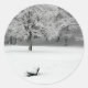 Un solitario banco se sienta en un parque cubierto de nieve como los árboles.