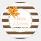 Elegantes rayas marrones y blancas acentuadas con una hoja de arce naranja adornan este pegatina nupcial de otoño. Su redacción está en un marco redondeado blanco.