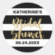 Estas franjas blancas negras y la ducha de novia de texto dorado favorecen a los pegatinas, son perfectas para una elegante ducha de moda temática. El diseño clásico a rayas negras está decorado con un tipo de letra purpurina dorado. Personalice a los pegatinas con el nombre de la futura novia y la fecha de la ducha. Nota: Este diseño no tiene purpurina de oro real. Es un gráfico de alta calidad hecho para parecerse al brillo dorado.