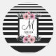 Pegatina Redonda Bandas negras y blancas monograma floral rosa