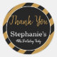 Patrón rayado negro y dorado con fiesta de cumpleaños blanco gracias pegatina. El diseño presenta un patrón de rayas negras y blancas, un círculo negro con un borde blanco y el texto personalizado en oro y blanco.