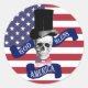 Funny orgulloso diseño patriótico de la bandera estadounidense con un divertido cráneo gótico vintage usando sombrero superior al estilo Abraham Lincoln y una bandera de la bandera de la estrella norteamericana de rayas blancas y azules rojas, con Dios bendiga el texto de Estados Unidos diciendo.