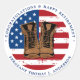 Añada el toque final a su fiesta militar de retiro con estos pegatinas militares de diseño de la bandera estadounidense y suministros de fiesta. Bandera estadounidense en blanco y azul rojo moderno, estrellas y rayas, con diseño de botas de combate de cuero. Este pegatina de los fiestas de la bandera estadounidense es perfecto para un fiesta militar de retiro, despliegues militares, celebración de la casa de bienvenida militar, graduación militar y soldados que se van fiesta. Perfecto para todo el ejército, ejército, protección de fronteras, patrulla fronteriza, oficial de conservación, guardabosques, guardián de juegos, aplicación federal de la ley. Personaliza este cartel patriótico de la bandera estadounidense con tu nombre de soldados y felicitaciones, bienvenido a casa, buena suerte o feliz retiro. Consulte nuestra colección para ver las invitaciones militares a la jubilación, regalos de graduación militar, favores partidarios y suministros. DERECHOS RESERVADOS © 2021 Judy Burrows, Black Dog Art - Todos los derechos reservados. Bandera estadounidense del ejército militar bota a Pegatina redondo clásico Fiesta de retiro