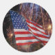 Pegatina Redonda Bandera Estadounidense Y Diseño De Fuegos Artifici