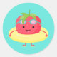Una adorable fresa kawaii aprendiendo a nadar usando un anillo de goma flotante inflable y gafas.