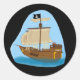 Un barco pirata único y original con el cráneo y la bandera de los cruces ondeando en el aire mientras navega hacia el mar. Ilustracion creado por Kirsten Edwards de Hinterland Harmony. Ver este diseño en camisetas, pegatinas, tarjetas, sellos postales, tazas, zapatos de Keds y más!