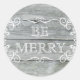 Moda y elegante sello de adhesivo navideño con fondo de grano de madera gris. Los sellos rústicos tienen las palabras SER MERCANCIOSOS con un marco blanco floreciente.