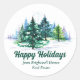 This beautiful custom company holiday gift sticker features gorgeous green Christmas trees in a winter landscape above your customized business name and Happy Holidays. Personalized holiday party stickers for a corporation or family looking for non photo cards.