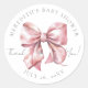 Una pegatina para baby shower de un lazo rosa con un adorable diseño de acuarela de color rosa bebé. En la parte superior, tiene el nombre de la madre y "Baby Shower", y en la parte inferior, la fecha. En el centro, junto al lazo rosa, está "¡Gracias!" en letra cursiva. Este diseño simple y minimalista de baby shower tiene texto gris en una mezcla de tipografía serif y cursiva, creando un aspecto sofisticado pero lindo y elegante. Puedes cambiar los colores de la fuente y el color de fondo a tu gusto. Etiqueta de Pegatina de Tema de Baby Shower de Lazo Rosa de Acuarela Elegante Personalizada.