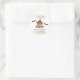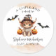 ¡Un pequeño boo está casi listo! Este adorable sticker de fiesta de bebé presenta una vaca de Halloween con linternas de calabaza, murciélagos voladores y salpicaduras de acuarela naranja.