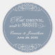 El monograma boda redondo favorece al pegatina con el tema "Comer, beber y estar casado" en color gris pizarra / azul y blanco. Personaliza con los nombres de novias y novios y la fecha de boda.