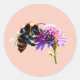 Una abeja vibrante se cierne delicadamente sobre una flor morada floreciente. El cuerpo a rayas de la abeja contrasta con los pétalos suaves, destacando la belleza de la polinización.