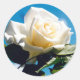 Rosa blanca bajo cielo azul. La vibrante foto de un hermoso rosa floreciente hace un gran regalo de arte floral en la pared. La belleza tranquila de la rosa blanca refleja nuevos comienzos, pureza, lealtad e inocencia. Las rosas blancas simbolizan el amor joven que la novia tiene por su cónyuge. Las rosas blancas también simbolizan el fundamento de una relación, razón por la cual a menudo se las ve en un día de boda. La rosa blanca es una flor boda tradicional. La rosa blanca es una flor apropiada para celebrar un nuevo vínculo romántico y marital.