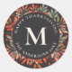 Nuestro moderno y elegante Pegatina Rojo Berries & Green Leaves Monograma Clásico Dark Round cuenta con un ilustracion acuarela de coloridas hojas otoño en tonos amarillos, naranjas, rubor, salvia y verde verde azulado acentuado por bayas rojas maduras, todo ello sobre un fondo oscuro de carbón vegetal gris. Todo el texto del pegatina se puede actualizar para crear un accesorio único de envío de correo o de envoltura de regalo.
