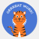 "GRREAT WORK" es el título de este pegatina azul - o puedes editar el texto para tus propias palabras de elogio. Este tigre amistoso, dibujado digitalmente, es un ánimo sonriente, lo que hace de esta una forma encantadora para que un profesor o padre dé un mensaje bien hecho!