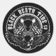 Logo de negocios ficticios para "Black Death Tire Co." Calavera alada y rata con banderas a cuadros en un sello redondo. Disponible en b/w y negro/naranja.
