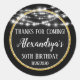 Elegante negro y dorado "¡Gracias por venir!" Etiquetas favoritas de cumpleaños con brillantes luces colgantes, marco purpurina dorado y fondo sólido, personalizadas para la estrella de cumpleaños.