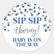El bebé Sip Sip Hooray está en camino pegatina de etiquetas con favores de ducha de bebé con un patrón de confetti azul y purpurina de plata. Perfecto para una ducha de bebé que decora champán o botellas de vino.