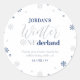 Este lindo pegatina fiesta de 1° cumpleaños presenta copos de nieve azules y plateados y tipografía elegante "Winter ONEderland". Perfecto para una fiesta temática de invierno. En mi tienda BaraBomDesign hay disponibles invitaciones y suministros para fiestas coincidentes.