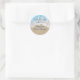 El alegre y divertido dicho, Dos Peces Menos en el Mar, acentúa a este Boda Gracias Pegatina en un fondo de agua azul, y arena de playa. Si necesita ayuda para personalizar este elemento, o necesita elementos de coordinación adicionales, simplemente contáctenos a prettyfancyinvites@gmail.com con su solicitud.
