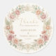 An elegant round “Thank You” wedding sticker featuring soft blush roses, delicate greenery, and refined gold script typography. Perfect for sealing wedding favors, gift boxes, envelopes, and thank-you cards. This design adds a romantic and timeless touch to any celebration. Fully customizable with names and date for your special day.