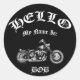 Motocicleta Bobber con, "Hola, mi nombre es BOB", con letras góticas. Camisetas, caramelos, cartas, regalos.