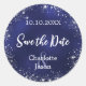 A Guardar el pegatina de fecha para su boda. Un fondo azul marino, texto blanco. El color azul es desigual. Decorada con finos destellos de plata. Personalice y agregue sus nombres y fecha de boda.