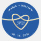 Sencillo, moderno, elegante, moda pegatina de boda azul real para sobres y favores con monograma - iniciales de la pareja, nombres, fecha y elegante corazón de cuerda dorada.