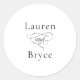 Con una simplicidad moderna, este minimalista diseño boda presenta un elegante estilo clásico con letras negras y un estilizado elemento caligráfico que explica la palabra, además de un estilo elegante. Personalice la plantilla de texto con los nombres de la novia y del novio para que sea un pegatina boda versátil que tenga tantos usos. Utilícelos como sellos para sobres en sus invitaciones de boda, o como etiquetas de favor o etiquetas para favores de boda.