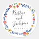 Diseño boda floral de estilo folk con tipografía contemporánea con detalles de caligrafía suave rodeado de flores rojas, amarillas y rosas.