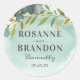Elegantes pegatinas de bodas con un lavado de acuarela verde/azul, encantadoras hojas de eucalipto botánico, salpicaduras de falso Relieve metalizado de oro, nombre de las parejas y fecha boda.