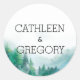 Un romántico pegatina boda acuático con un paisaje montañoso sereno envuelto en frondosos bosques verdes. Los suaves tonos de esmeralda y azul cielo evocan una sensación de calma y elegancia natural. Esta escena de ensueño, inspirada en la naturaleza, capta el espíritu del amor eterno y la aventura, perfecto para las parejas que encuentran belleza en el exterior y buscan un toque de sofisticación en su día especial.